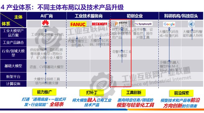 报告对不同的主体布局进行了梳理划分。总结来说,科技大厂主要基于通用基础大模型赋能工业领域,主打“大而全”;创新成长型企业则发挥自身在细分领域的经验沉淀打造垂直行业大模型,主打“专而精”;此外,还有传统的工业技术服务商在既有产品中融入AI能力。