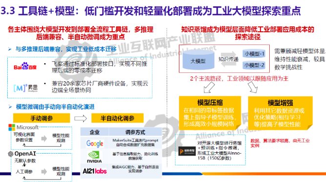 报告指出,低门槛开发和轻量化部署成为工业大模型探索重点。其中,知识蒸馏成为模型层面降低工业部署应用成本的探索途径。