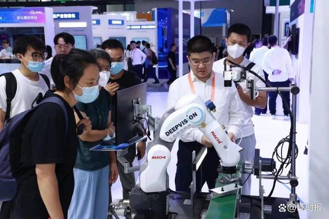 中国电信展区内,一只机械臂正忙碌着将流水线上的产品一一堆放,有趣的是,原本在产线上不规律摆放的产品经过机械臂,都能按照设定好的角度和位置堆放得整整齐齐,这得益于机械臂上方一只始终在监测的“眼睛”。