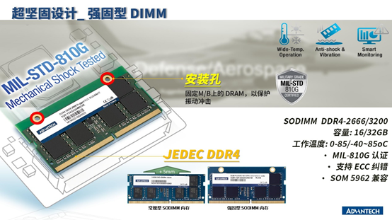 研华科技内存条SQRAM产品系列,产品接口金手指部分采用工业级的30u”镀金工艺加固,以防经常性的插拔动作带来的磨损. 同时在应对震动较强的场景时,会有客制化的加固板型,通过固定孔把产品固定在板子上,通过点胶等方式进行防抗防震。此外,在应对各种宽温工作场景时,研华内存条产品也提供不同温度的斛方案,如车规级的-40°C~125°C,工规级的-40°C~85°C等产品。